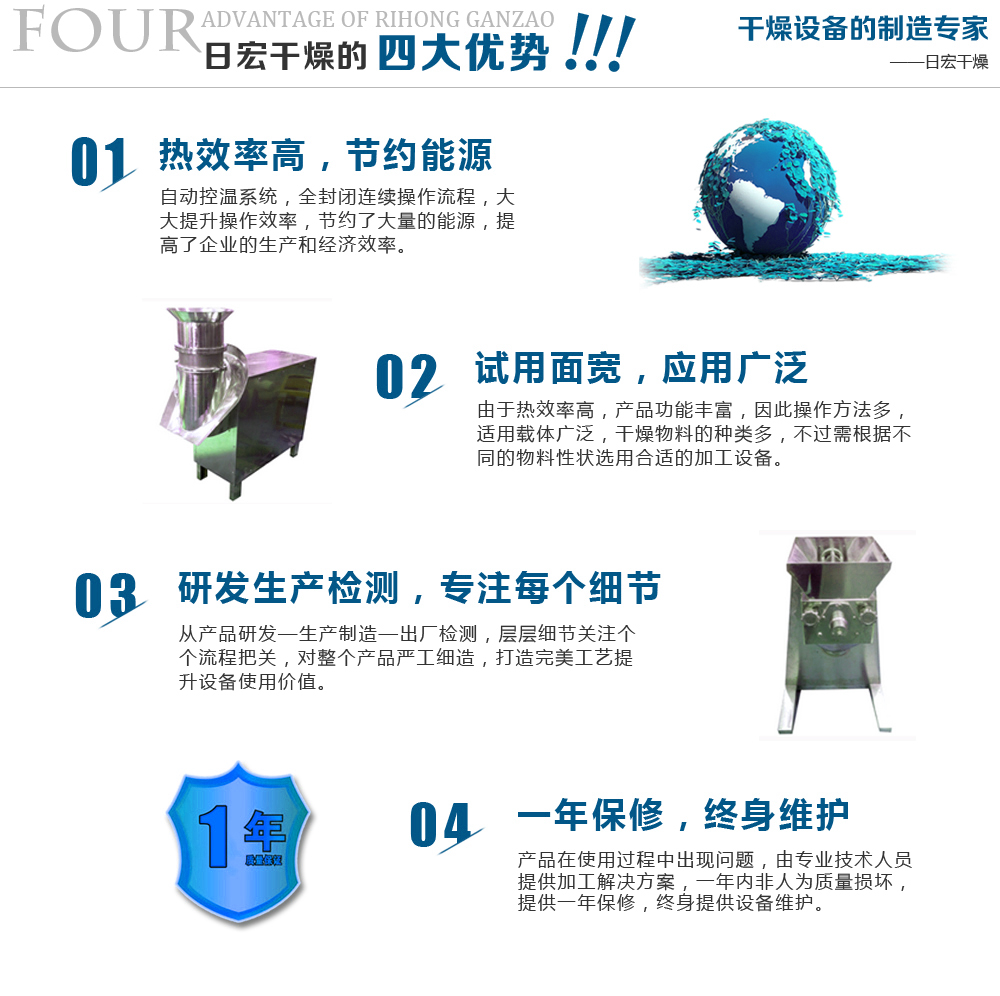 常州市日宏干燥有限公司可根據(jù)用戶的實(shí)際要求進(jìn)行工程設(shè)計(jì),目前單條生產(chǎn)線的產(chǎn)量有500kg/h、1000 kg/h .1500 kg/h。3000 kg/h等。雞精生產(chǎn)主要包括粉碎、秤重、混合、制粒、干燥、分篩、加香等步驟,我公司生產(chǎn)的具有工藝設(shè)計(jì)緊湊、設(shè)備制作精美、流水化運(yùn)作程度高、產(chǎn)品品質(zhì)穩(wěn)定、易清潔保養(yǎng)等特點(diǎn)。設(shè)備與物料接觸部位全部采用優(yōu)質(zhì)不銹鋼材料,并經(jīng)過(guò)精細(xì)拋光,耐鹽份腐蝕,清洗更方便,符合食品生產(chǎn)管理的QS要求及GMP標(biāo)準(zhǔn)。